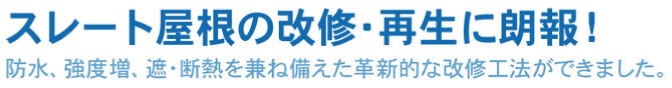 硬化速度が抜群のエポキシ系硬化樹脂「特殊補強材」を用いて、先ずは劣化したスレート屋根の漏水を止め、強度を復元します。そのあと、遮熱・断熱・抗菌塗料「特殊遮熱断熱塗料」を湿布することで、遮・断熱効果により室内の温度を下げることができます。